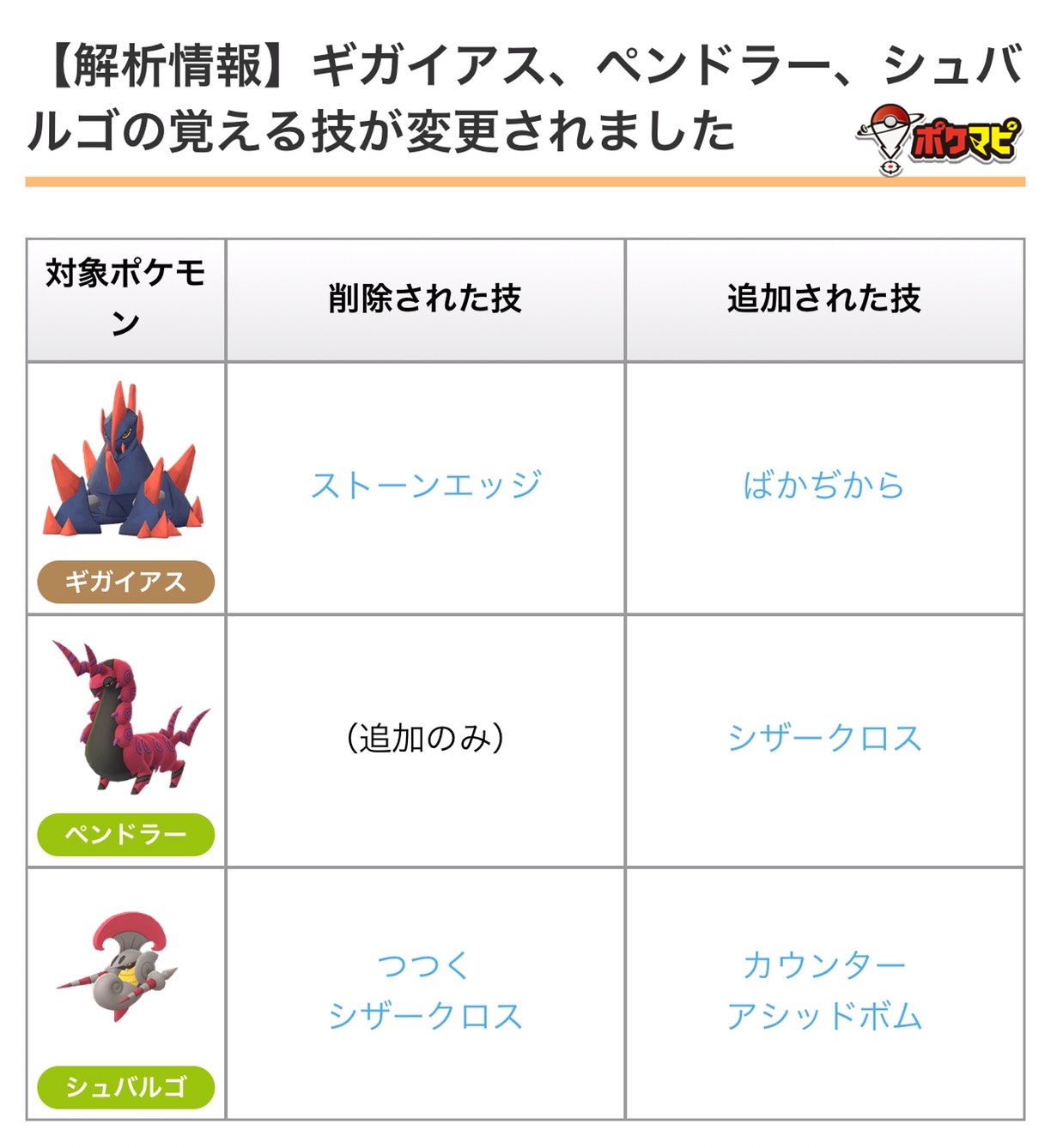 ポケモンgo攻略情報 ポケマピ 解析情報 ギガイアス ペンドラー シュバルゴの覚える技が変更されました T Co Q0avef63ea ポケモンgo
